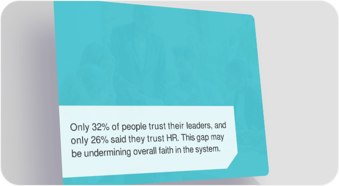 Only 32%ofpeopletrust their leaders, and only 26%saidthey trust HR. Thisgap may beunderminingoverall faithin thesystem.