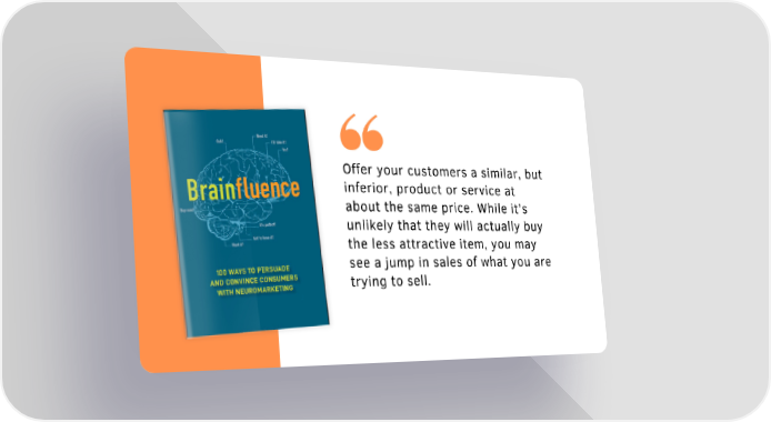 Brainfluence Page 16 Offer your customers a similar, but inferior, product or service at about the same price. While it’s unlikely that they will actually buy the less attractive item, you may see a jump in sales of what you are trying to sell.