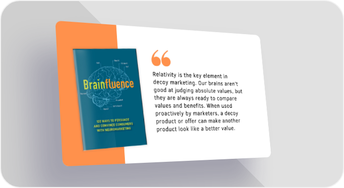 Relativity is the key element in decoy marketing. Our brains aren’t good at judging absolute values, but they are always ready to compare values and benefits. When used proactively by marketers, a decoy product or offer can make another product look like a better value.