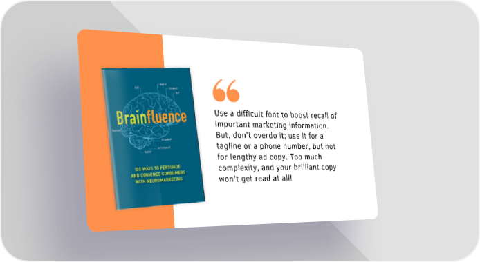 Use a difficult font to boost recall of important marketing information. But, don’t overdo it; use it for a tagline or a phone number, but not for lengthy ad copy. Too much complexity, and your brilliant copy won’t get read at all!