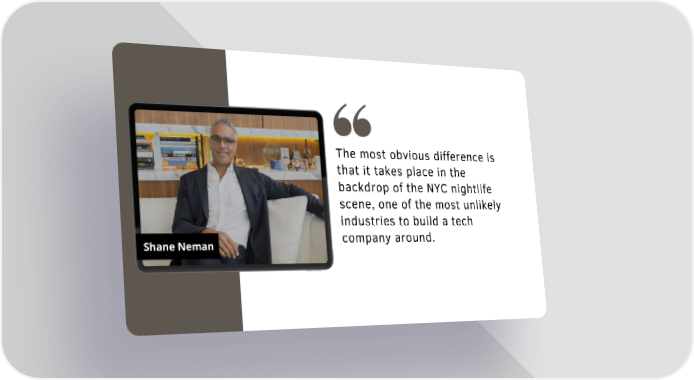 The most obvious difference is that it takes place in the backdrop of the NYC nightlife scene, one of the most unlikely industries to build a tech company around. Shane Neman