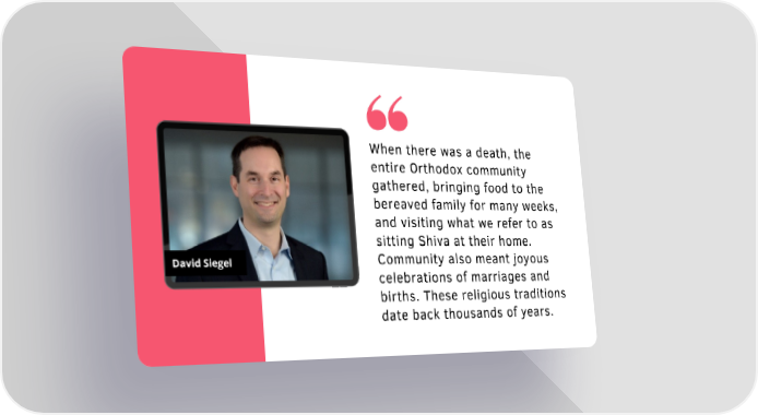When there was a death, the entire Orthodox community gathered, bringing food to the bereaved family for many weeks, and visiting what we refer to as sitting Shiva at their home. Community also meant joyous David Siegel celebrations of marriages and births. These religious traditions date back thousands of years.