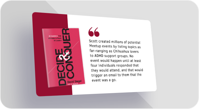 Scott created millions of potential Meetup events by listing topics as far-ranging as Chihuahua lovers to ADHD support groups. No event would happen until at least four individuals responded that they would attend, and that would trigger an email to them that the event was a go.