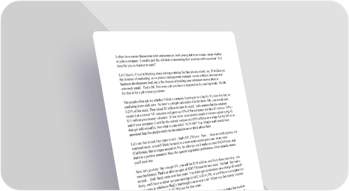 I often have career discussions with entrepreneurs, both young and more mature, about whether to join a company. I usually pull the old trick of answering their question with a question: "Is it time for you to learn or to earn?" Let's face it, if you're thinking about joining a startup that has already raised, say, $5 million (as the director of marketing, or as product management manager, senior architect, international business development lead, etc.), the chances of making your retirement money there is extremely small. That's OK. Not every job you have is supposed to be your big break. It's OK for that to be a job where you learn. Yet people often ask me whether I think a company is going to be a big hit. It's clear that they’re confusing learn with earn. So here’s a simple calculation I do for them: OK, you would own 0.25% of the stock. They raised $5 million in their B round. Let's assume that the company raised it at a normal VC valuation and gave up 33% of the company and thus $5 million / 33% = $15 million postmoney valuation. If you never raise another round of venture capital (a big if), and if your company is sold for the normal venture exit ($50 million on average for the 200 or so that get sold annually), then what is your stake? $125,000? Yup. Simple math would have answered that, but people rarely do the calculations or think about them. Let's say that it took four years to exit – that's $31,250/year. Now… these are stock options, not restricted stock, so you'll likely be taxed at a shortterm capital gains rate. In my state (California), that averages around 42.5%. So after tax you'd make an extra $18,000/year; and that's in a positive scenario! Also, this ignores liquidation preferences, which actually means you'll earn less. Now let's go crazy. Say you get 1%, you sell for $150 million, and it's in three years (e.g., you won the lottery). That's an aftertax gain of $287,500/year for two years. Not bad. But wait a second… Doh! Stock vests over four years. You didn't get acceleration on a change of control? Sorry, we'll have to either cut your earnings in half, to $143,750, or you'll have to complete two more years at whichever BigCo that bought you to earn it all. Either way that money’s earned over four years – so it's $143,750/year for four years. Don't get me wrong. This isn't shabby money. Most people would love to make that much in four years. But don’t confuse getting stock in a company with retirement. Given that a decent home in an expensive area such as Palo Alto or Santa Monica will set you back $2 million, it's hardly riding off into the sunset. It’s why Jason says “the riskadjusted economics of starting a company suck.” I'm not trying to depress you; I'm just trying to be realistic. If you want to earn – and by earn, I mean the chance to buy your house outright – you have to start a company or join as a senior executive. Or you have to hit the lottery and be an early middle management player at Google, Facebook, MySpace or Twitter. Let's be honest: how many of those are created per year in the entire country? One? Two, max? I spoke with an investor recently who told me that 1,500 deals get funded every year in the US; 80 (5.3%) eventually sell for $50 million, and only eight (0.5%) eventually sell for $150 million or more.