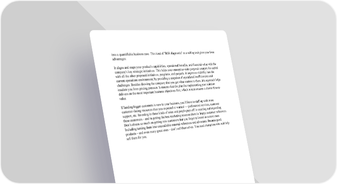 into a quantifiable business case. This kind of "ROI diagnostic" as a selling tool gives you three advantages: It aligns and maps your product's capabilities, operational benefits, and financial value with the company's key strategic initiatives. This helps your enterprisewide proposal compete for capital with all the other proposed initiatives, programs, and projects. It improves visibility into the current operations environment, by providing a snapshot of operational inefficiencies and challenges. Besides showing the company that you get what matters to them, this approach helps insulate you from pricing pressure. It ensures that the plan for implementing your solution delivers on the most important business objectives first, which in turn ensures a shorter time to value. If landing bigger customers is new to your business, you’ll have to staff up with more customerfacing resources than you expected or wanted — professional services, customer support, etc. Investing in these kinds of roles and people pays off in securing and expanding these customers – and in getting the best marketing resource there is: happy customer references. Don’t obsess so much on getting new customers that you forget to invest in current ones. Including turning them into unassailable external references and advocates. Because good products – and even many great ones – don’t sell themselves. You need champions who will help sell them for you.