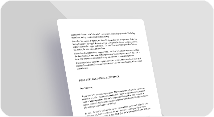 and beyond – because what’s the point? I use my extra time reading up on topics like finding dream jobs, starting a business and online marketing. I can often feel trapped in my role, not allowed to try anything new or experiment. Rather than feeling trapped by my dayjob, I want to use it as a springboard to discover what else I can learn and how I can make a bigger contribution. The more I learn about other parts of our business and market, the more ways I can contribute. I know I need to perform in my ‘day job’ (what I was hired for), but aren’t there ways that I can also keep learning in other areas, including in making the company more money? Don’t look at these other interests as distractions from my role, but rather as possible complements. The career path here seems like a mystery, or worse – arbitrary, where executive favorites get all the attention and promotions, even when more than a few don’t seem that great, and even include some disasters. DEAR EMPLOYEE (FROM EXECUTIVES) Dear Employee, So you want to be successful in your career. Maybe you believe right now that you deserve a promotion or a raise. Or you’re just bored at work. Maybe people don’t respect your (great) ideas, or listen to you there. That you’re not getting a fair shake from either the owners or perhaps customers. Maybe our management systems are just broken and defeat our people’s best efforts (though we can’t admit that publicly). Because…the truth is, while we like you as a person and think you’re swell, and you’re doing well in your job, that’s the minimum. We don’t see how you’re going out of your way to contribute in other ways. (And all those side projects you’re working on don’t count. What, you think people here don’t know about them?) Here’s the deal. If things aren’t happening the way you want, it’s time to take charge of your own destiny rather than believe it’s “other people’s fault” such as your manager, owner or team’s fault. Don’t blame others for not recognizing your greatness. If you wait for people to recognize or discover you, here or anywhere, chances are you’ll be waiting a loooong time. The time will never be perfect. The opportunity will never be perfect. You have to work with what you have – as frustrated or defeated as you feel. A company is full of people who need things. Products launched, marketing campaigns run, sales closed, employees hired, customers serviced and bills paid. There will always be innumerable problems to solve; pick one and do something about it.