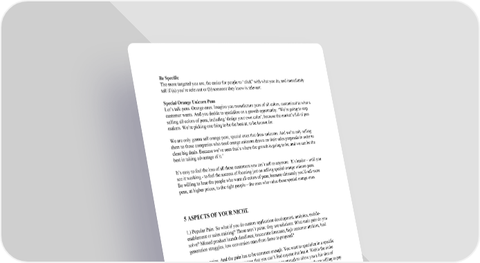Be Specific The more targeted you are, the easier for people to “click” with what you do, and immediately tell if (a) you’re relevant or (b) someone they know is relevant: Special Orange Unicorn Pens Let’s talk pens. Orange ones. Imagine you manufacture pens of all colors, customized to what a customer wants. And you decide to specialize on a growth opportunity. “We’re going to stop selling all colors of pens, including ‘design your own color’, because the market’s full of pen makers. We’re picking one thing to be the best at, to be known for. We are only gonna sell orange pens, special ones that draw unicorns. And we’re only selling them to those companies who need orange unicorns drawn on their sales proposals in order to close big deals. Because we’ve seen that’s where the growth is going to be, and we can be the best in taking advantage of it.” It’s easy to feel the loss of all those customers you can’t sell to anymore. It’s harder – until you see it working to feel the success of focusing just on selling special orange unicorn pens. Be willing to lose the people who want all colors of pens, because ultimately you’ll sell more pens, at higher prices, to the right people – the ones who value those special orange ones. 5 ASPECTS OF YOUR NICHE 1.) Popular Pain: So what if you do custom application development, analytics, mobile enablement or sales training? Those aren’t pains; they are solutions. What main pain do you solve? Missed product launch deadlines, inaccurate forecasts, high customer attrition, lead generation struggles, low conversion rates from demo to proposal? Those are pains. And the pain has to be common enough: You want to specialize in a specific pain you solve, but not get so narrow that you can’t find anyone that has it. Within the niche you’re targeting, what pain can you solve that’s common enough to allow you a fair shot of finding customers? You know that a pain is common when you see that people are willing to pay money to solve it, repeatedly. 2.) Tangible Results: Where can you show concrete or detailed results? How can you answer the question “What do I get?” Example: “Peace of mind or a better night’s sleep” How do you make that tangible? “Grow leads 217%” or “Shorten monthend closing to 12 hours” are much more concrete. If you struggle with hard numbers, you can use visual examples or detailed customer stories and testimonials. 3.) Believable Solution: It’s easy to make claims of “more revenue, lower costs, blah blah.” Buyers hear this every day. Why should they believe you and your claims? There’s two sides to this: (a) They have to believe you can deliver, and (b) they have to believe it’ll work for them, including their own ability and capacity to do it. Detailed case studies of similar companies are