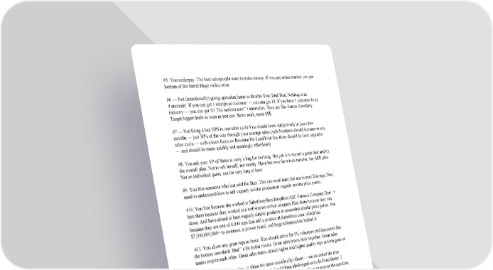 #5. You underpay. The best salespeople want to make money. If you pay undermarket, you get bottom of the barrel.Huge rookie error. #6 –– Not (intentionally) going upmarket faster to Double Your Deal Size. Nothing is an 4 anomaly: If you can get 1 enterprise customer –– you can get 10. If you have 1 customer in an industry –– you can get 10. The outliers aren’’ t anomalies. They are The Future. Corollary: Target bigger deals as soon as you can. Same work, more $$$. #7 –– Not firing a bad VPS in one sales cycle You should know subjectively in just a few months –– just 50% of the way through your average sales cycle Numbers should increase in one sales cycle –– with a keen focus on Revenue Per Lead First few hires should be clear upgrades –– and should be made quickly and seemingly effortlessly #8. You ask your VP of Sales to carry a bag for too long. Her job is to recruit a great deal and hit the overall plan. Not to sell herself, not mostly. Have her own the whole number, the ARR plan. Not an individual quota, not for very long at least. #9. You hire someone who last sold Nu Skin. This can work later, but not in your first reps.They need to understand how to sell vaguely similar products at vaguely similar price points. #10. You hire because she worked at Salesforce/Box/DropBox/ABC Famous Company.Don’’ t hire them because they worked at a wellknown or hot company.Hire them because they can close. And have closed at least vaguely similar products at somewhat similar price points. Not because they are one of 4,000 reps that sell a product at Salesforce.com, which has $7,000,000,000+ in revenues, a proven brand, and huge infrastructure behind it. #11. You allow any great reps to leave. You should strive for 0% voluntary attrition,not to fire the bottom onethird. That’’ s for boiler rooms. Great sales teams stick together. Great sales teams inspire each other. Great sales teams attract higher and higher quality reps as time goes on. #12. Not doubling the plan. ☺ Once the team was (finally) Great –– we exceeded the plan. Every quarter, every year. Always. But...... I should have challenged us to do Even Better. I should have pushed harder the same way Parker at Zenefits pushed Sam to answer the question, ““What would it take to do $20M instead this year instead of $10M?”” CASE STUDY: ADVICE FROM THE VP SALES BEHIND LINKEDIN AND ECHOSIGN WHY SALESPEOPLE SHOULDN’T PROSPECT If you haven’t specialized your sales team roles yet, nothing will make a bigger impact in your team and ability to grow than biting the bullet and doing it. Specializing sales roles is a cornerstone of Predictable Revenue. Without specializing, your team will struggle. Prospectors need to prospect. And, yes, your closers should prospect –– we will never tell you that anyone on