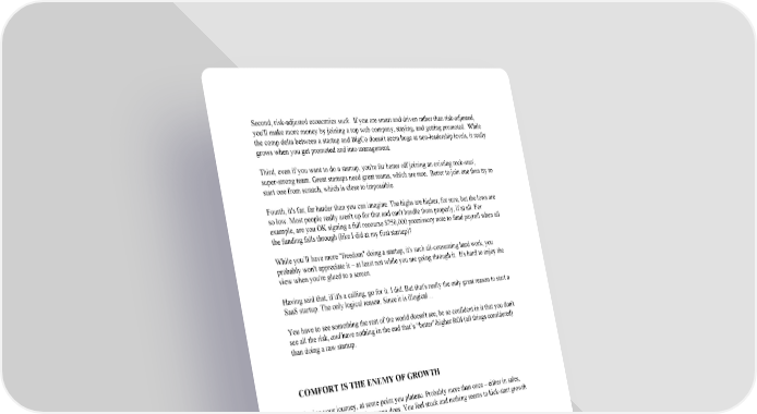 Second, riskadjusted economics suck. If you are smart and driven rather than riskadjusted, you'll make more money by joining a top web company, staying, and getting promoted. While the comp delta between a startup and BigCo doesn't seem huge at nonleadership levels, it really grows when you get promoted and into management. Third, even if you want to do a startup, you're far better off joining an existing rockstar/, superstrong team. Great startups need great teams, which are rare. Better to join one than try to start one from scratch, which is close to impossible. Fourth, it's far, far harder than you can imagine. The highs are higher, for sure, but the lows are so low. Most people really aren't up for that and can't handle them properly, if at all. For example, are you OK signing a full recourse $750,000 promissory note to fund payroll when all the funding falls through (like I did at my first startup)? While you’ll have more "freedom" doing a startup, it's such allconsuming hard work, you probably won't appreciate it – at least not while you are going through it. It's hard to enjoy the view when you're glued to a screen. Having said that, if it's a calling, go for it. I did. But that's really the only great reason to start a SaaS startup. The only logical reason. Since it is illogical… You have to see something the rest of the world doesn't see, be so confident in it that you don't see all the risk, and have nothing in the end that’s “better”/higher ROI (all things considered) than doing a raw startup. COMFORT IS THE ENEMY OF GROWTH During your journey, at some point you plateau. Probably more than once – either in sales, energy or innovation. Everyone does. You feel stuck and nothing seems to kickstart growth again. It’s usually because: ● You’ve tapped out your networks and relationships. ● You or your business doesn’t stand out, sounding like everyone else. ● You’re overly dependent on a single person for a key function such as bringing in leads, closing deals or engineering. ● The market or customer needs have changed, and changing the business feels impossible or impractical. You’ve hit a business model or market wall but aren’t sure what to do about it. Sometimes a business breaks this plateau and ends up growing by hundreds of millions of dollars. And others struggle, unable to break their slump. What was the difference?
