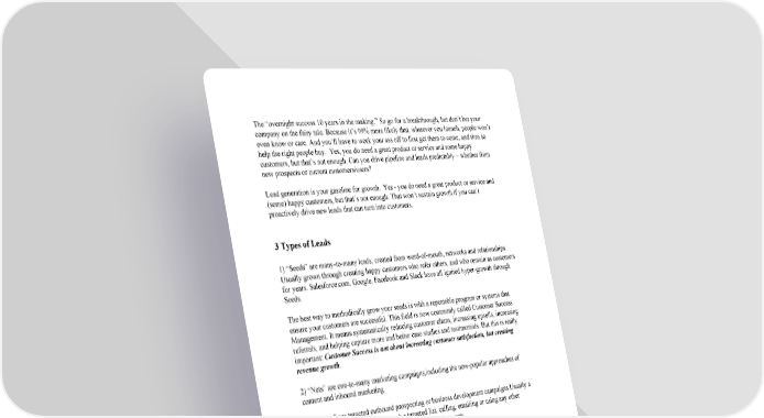 The “overnight success 10 years in the making.” So go for a breakthrough, but don’t bet your company on the fairy tale. Because it’s 99% more likely that, whatever you launch, people won’t even know or care. And you’ll have to work your ass off to first get them to come, and then to help the right people buy. Yes, you do need a great product or service and some happy customers, but that’s not enough. Can you drive pipeline and leads predictably – whether from new prospects or current customers/users? Lead generation is your gasoline for growth. Yes you do need a great product or service and (some) happy customers, but that’s not enough. That won’t sustain growth if you can’t proactively drive new leads that can turn into customers. 3 Types of Leads 1) “Seeds” are manytomany leads, created from wordofmouth, networks and relationships. Usually grown through creating happy customers who refer others, and who remain as customers for years. Salesforce.com, Google, Facebook and Slack have all ignited hypergrowth through Seeds. The best way to methodically grow your seeds is with a repeatable program or systems that ensure your customers are successful. This field is now commonly called Customer Success Management. It means systematically reducing customer churn, increasing upsells, increasing referrals, and helping capture more and better case studies and testimonials. But this is really important: Customer Success is not about increasing customer satisfaction, but creating revenue growth. 2) “Nets” are onetomany marketing campaigns,including the nowpopular approaches of content and inbound marketing. 3) “Spears” are targeted outbound prospecting or business development campaigns.Usually a human is involved, working through a targeted list, calling, emailing or using any other technique that helps them make contact and get appointments. Too many companies obsess over a single form of lead generation and ignore the others. To build a house you need multiple tools: a hammer, a saw and a screwdriver. Likewise, Seeds, Nets and Spears are complementary. Know why, how and when to use each tool. The three lead types – Seeds, Nets and Spears – have different funnels, conversion rates, expectations, sales cycles, average deal sizes, ideal target customers and methods of increasing them. The important thing is to know which type(s) will work best for your business, and in what mix or balance.