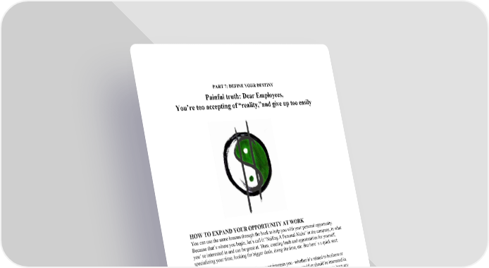 PART 7: DEFINE YOUR DESTINY Painful truth: Dear Employees, You’re too accepting of “reality,”and give up too easily HOW TO EXPAND YOUR OPPORTUNITY AT WORK You can use the same lessons through the book to help you with your personal opportunity. Because that’s where you begin, let’s call it “Nailing A Personal Niche” in the company, in what you’ re interested in and can be great at. Then, creating leads and opportunities for yourself, specializing your time, looking for bigger deals, doing the time, etc. But here’ s a quick start: 1. Make a list of what you want to do or most interests you –whether it’s related to business or not. Then add to the list at least 3 ideas around revenue that you could or should be interested in, such as Learn how to sell or Learn copywriting. From this list, can you see any ways to learn any at work, to get paid to learn what you want to learn or do anyway? 2. Read the 20 Interviews section again in Part 1 on Nailing A Niche. Use the same approach. Interview people in your company, as well as partners, prospects or customers as needed. Can you find a problem that requires you to learn or do something from your list? What problem do you want to solve? If it’s not something that your leaders care about, how can you reframe it from a nice to have into a need to have for them? 3. Find a mentor, coach or champion internally to get advice from, who can support you – and will be painfully honest with you about where you need to improve (everyone does).