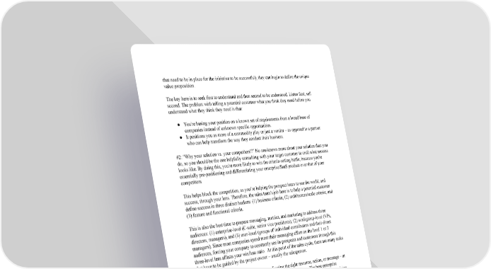 that need to be in place for the initiative to be successful), they can begin to define the unique value proposition. The key here is to seek first to understand and then second to be understood. Listen first, sell second. The problem with telling a potential customer what you think they need before you understand what they think they need is that: ● You're basing your position on a known set of requirements from a broad base of companies instead of unknown specific opportunities. ● It positions you as more of a commodity play or just a vendor – as opposed to a partner who can help transform the way they conduct their business. #2: "Why your solution vs. your competitors'?" No one knows more about your solution than you do, so you should be the one helpfully consulting with your target customer to craft what success looks like. By doing this, you're more likely to win the criteriasetting battle, because you're essentially prepositioning and differentiating your enterprise/SaaS product over that of your competitors. This helps block the competition, as you’re helping the prospect learn to see the world, and success, through your lens. Therefore, the sales team's job here is to help a potential customer define success in three distinct buckets: (1) business criteria; (2) architecture/scale criteria; and (3) feature and functional criteria. This is also the best time to prepare messaging, metrics, and marketing to address three audiences: (1) enterpriselevel (Csuite, senior vice presidents); (2) workgrouplevel (VPs, directors, managers); and (3) userlevel (groups of individual contributors and their direct managers). Since most companies spend most their messaging effort on the level 1 or 3 audiences, forcing your company to constantly see its prospects and customers through this threelevel lens affects your win/loss ratio. At this point of the sales cycle, there are many tasks that have to be guided by the project owner – usually the salesperson. This is where they show their value: by coordinating the right resource, action, or message – at the right level and at the right time – to determine success or failure. The best enterprise salespeople are coaches or entrepreneurs, ensuring all the audiences at a prospect are receiving what they need, that resources are rallied from your company, stumbling blocks are uncovered and avoided, and surprises are eliminated. This is key because your biggest competition isn't just other startups, perpetually licensed onpremise packages, homegrown solutions, or incumbent vendors. It's inertia. It takes a lot for a Big Company to decide and successfully implement a new solution. Enterprise salespeople often can’t achieve that big account escape velocity, and lose to Do Nothing and No Decision more often than to any other competitor. #3: "Why now vs. investing in another area of our business?" Once you've eliminated the competition and are on the path to technical validation, you have to turn the value proposition