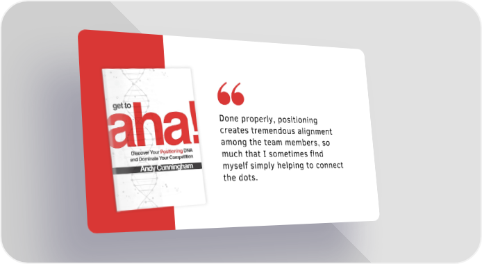 Get to Aha!: Discover your positioning DNA and dominate your competition Page 8 Page 10Done properly, positioning creates tremendous alignment among the team members, so much that I sometimes find myself simply helping to connect the dots.