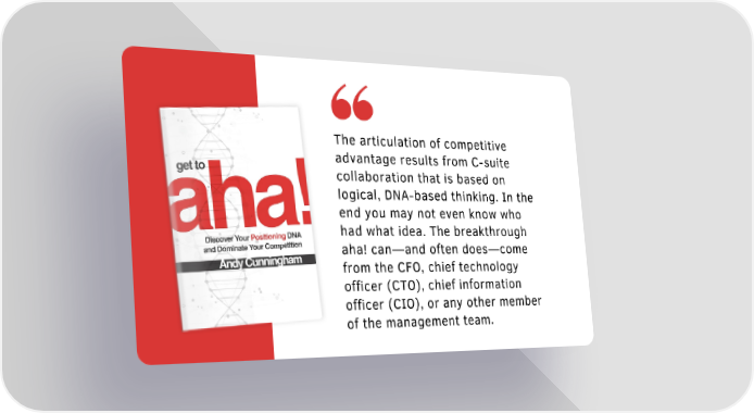 The articulation of competitive advantage results from C-suite collaboration that is based on logical, DNA-based thinking. In the end you may not even know who had what idea. The breakthrough aha! can—and often does—come from the CFO, chief technology officer (CTO), chief information officer (CIO), or any other member of the management team.