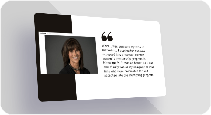 When I was pursuing my MBA in marketing, I applied for and was accepted into a mentor-mentee women’s mentorship program in Minneapolis. It was an honor, as I was one of only two at my company at that time who were nominated for and accepted into the mentoring program.
