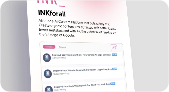 INKforall All-in-one AI Content Platform that puts safety first. Create organic content easier, faster, with better ideas, fewer mistakes and with 4X the potential of ranking on the 1st page of Google.