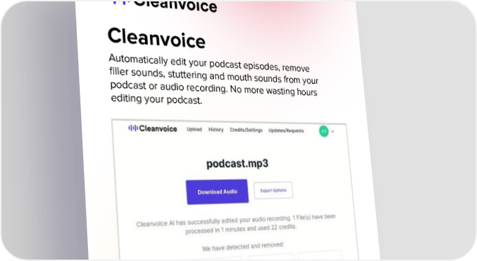 Cleanvoice Automatically edit your podcast episodes, remove filler sounds, stuttering and mouth sounds from your podcast or audio recording. No more wasting hours editing your podcast.