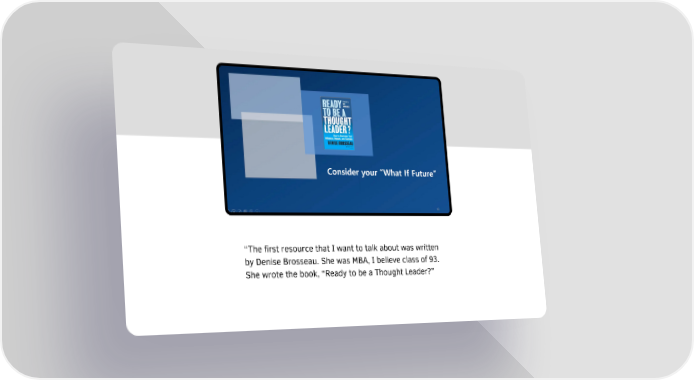 “The first resource that I want to talk about was written by Denise Brosseau. She was MBA, I believe class of 93. She wrote the book, “Ready to be a Thought Leader?”