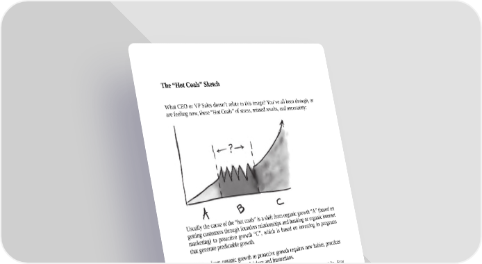 The “Hot Coals” Sketch What CEO or VP Sales doesn’t relate to this image? You’ve all been through, or are feeling now, these “Hot Coals” of stress, missed results, and uncertainty: Usually the cause of the “hot coals” is a shift from organic growth “A” (based on getting customers through founders relationships and hustling or organic internet marketing) to proactive growth “C”, which is based on investing in programs that generate predictable growth. Shifting from organic growth to proactive growth requires new habits, practices and systems, causing a lot of delays and frustrations. Appreciate that the shift is a process which does not happen overnight. Stay committed, persistent, and patient as you get through the “Hot Coals,” whether it takes months or--in many cases--years. My goal for this book is to help you get through the hot coals as quickly, easily and profitably as possible. That will only happen if the management team and board understand the same fundamental principles around what creates predictable revenue (and it’s not about hiring more salespeople).
