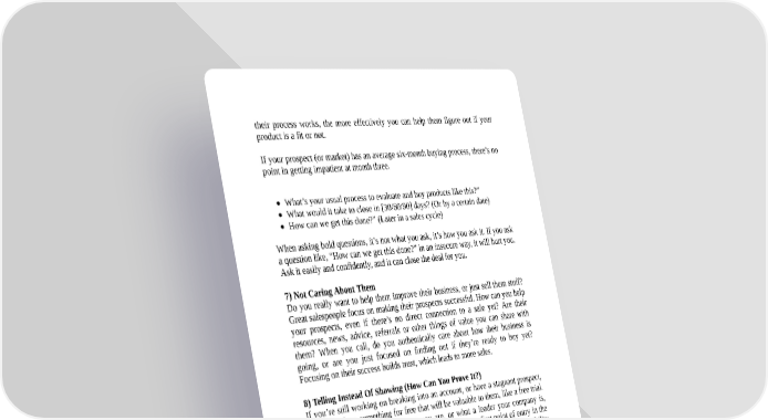 their process works, the more effectively you can help them figure out if your product is a fit or not. If your prospect (or market) has an average six-month buying process, there’s no point in getting impatient at month three. What’s your usual process to evaluate and buy products like this?” What would it take to close in [30/60/90] days? (Or by a certain date) How can we get this done?” (Later in a sales cycle) When asking bold questions, it’s not what you ask, it’s how you ask it. If you ask a question like, “How can we get this done?” in an insecure way, it will hurt you. Ask it easily and confidently, and it can close the deal for you. 7) Not Caring About Them Do you really want to help them improve their business, or just sell them stuff? Great salespeople focus on making their prospects successful. How can you help your prospects, even if there’s no direct connection to a sale yet? Are their resources, news, advice, referrals or other things of value you can share with them? When you call, do you authentically care about how their business is going, or are you just focused on finding out if they’re ready to buy yet? Focusing on their success builds trust, which leads to more sales. 8) Telling Instead Of Showing (How Can You Prove It?) If you’re still working on breaking into an account, or have a stagnant prospect, try giving them something for free that will be valuable to them, like a free trial. Instead of telling them how great you are, or what a leader your company is, how can you prove it? For example, a trial can create a first point of entry in the “getting to know you” stage and give buyers a taste that you have the credibility to help them. Don’t just throw free stuff at them. Tailor what you’re offering to whatever their needs or problems are, or else it’s likely to be a waste of time for both parties. 9) Dragging Your Feet In Disqualifying I love Tom Batchelder’s book titled Barking Up A Dead Horse (and I recommend it!). Because of desperation, pressure or a lack of clarity on their “Ideal Customer Profile,” executives and salespeople will beat dead or poor-fit opportunities to death, simply because that opportunity is in front of them, and