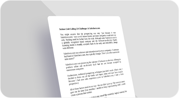 Serious Cold Calling 2.0 Challenges At Salesforce.com You might assume that the prospecting was easy "just because it was Salesforce.com," now a well known brand, and those companies would take our calls. Nothing could be further from the truth. Although today Salesforce.com is a globally recognized brand company and the Software-as-aService (SaaS) licensing model is broadly accepted, back in the early and mid-2000’s, things were different: Salesforce.com was unknown and misunderstood in most companies. If someone had heard of Salesforce.com, they typically thought, “Don’t you offer outsourced sales teams?” Salesforce.com was pioneering the concept of Software-as-aService, offering its products online and on-demand; SaaS had not yet become accepted by mainstream companies. Furthermore, traditional prospecting techniques just didn’t work. (That's why I decided to throw out all the books and legacy ideas and start from scratch. Because I had zero sales experience prior to Salesforce.com, I had a fresh perspective.) All of these factors stood in our way—but we didn’t give up. The executive team gave me the time (four months) I needed to keep experimenting until I could create a process that worked. Are you making excuses (which may sound like extremely logical reasons) for not finding ways to get around your challenges?