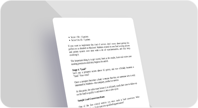 Score >30: -15 points Score 0 to 30: -5 points If you want to implement this kind of service, don’t worry about getting this perfect or as detailed as Marketo! Marketo created its own lead scoring process and points system over time with a lot of experimentation, and they keep evolving it. The important thing is to get started, look at the results, learn and evolve your scoring processes until they begin to be useful. Stage 4. “Lead” Let’s say a prospect scores above 65 points, and now officially becomes a “lead.” Now what? Once a prospect becomes a lead, it means that they are someone who is truly interested in Marketo—the company, product or service. At this point, the sales team knows it is definitely worth their time to follow up on the lead to qualify it and move it into a sales cycle. Sample Lead Conversion Rates One of the five critical metrics you must track is lead conversion. What percentage of new leads turn into qualified opportunities? Here’s some example data on Marketo’s conversion rates: