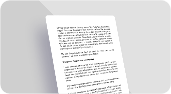 led them through their own discovery process. They “got it” and the complaints stopped. Even better, they could be much more effective in teaching other team members or new hires about the comp plan so these frustrations didn’t pop up again with the next generation of new team members. We ended up in the same place we began: the comp plan didn’t change. One could feel like we wasted time, but I felt it was a fantastic use of time as a coaching exercise and as a way to increase trust and transparency in the team. The reps felt more connected to the team and the systems because they now understood more intimately where everything came from and why—they owned it. My only disappointment was that I had hoped they would come up with something I had missed so we could improve the plan! Transparent Compensation And Reporting I had a convenient advantage that helped me transparently publish everyone’s compensation on the team: they all were on the same basic plan structure (same base salary, same bonus and commission rates). No one had special deals even though some people had much more experience than others. Those with more experience or expectations could earn the extra compensation through higher results. With transparency compensation, the whole team could see who earned the most and why—how their higher results translated directly into more money. Publishing compensation also eliminated compensation and payroll errors, and reduced by 80% the amount of time I had to spend on tracking and reporting compensation. If you haven’t tracked and reported on compensation, it’s a pain. For a long time, we used spreadsheets at Salesforce.com to report commissionable results. The secrecy model: Run the reports: What were each person’s results? Prepare the report and calculate commissions. Cut the report into private reports for each person. Email or sit with each person to share results and ensure correctness. Fix the report as necessary.