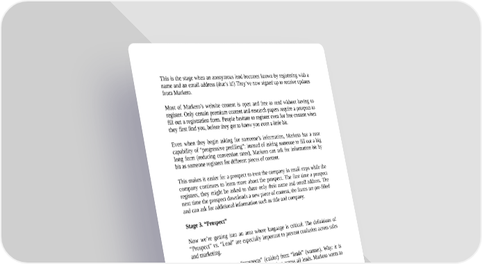 This is the stage when an anonymous lead becomes known by registering with a name and an email address (that’s it!) They’ve now signed up to receive updates from Marketo. Most of Marketo’s website content is open and free to read without having to register. Only certain premium content and research papers require a prospect to fill out a registration form. People hesitate to register even for free content when they first find you, before they get to know you even a little bit. Even when they begin asking for someone’s information, Marketo has a neat capability of “progressive profiling”: instead of asking someone to fill out a big long form (reducing conversion rates), Marketo can ask for information bit by bit as someone registers for different pieces of content. This makes it easier for a prospect to trust the company in small steps while the company continues to learn more about the prospect. The first time a prospect registers, they might be asked to share only their name and email address. The next time the prospect downloads a new piece of content, the forms are pre-filled and can ask for additional information such as title and company. Stage 3. “Prospect” Now we’re getting into an area where language is critical. The definitions of “Prospect” vs. “Lead” are especially important to prevent confusion across sales and marketing. Marketo differentiates “prospects” (colder) from “leads” (warmer). Why: it is highly inefficient to evenly spread sales’ time across all leads. Marketo wants to prioritize where its sales team spends its time on lead follow up. They tell them apart by the “lead score,” which rates how hot or not someone is, on a scale of 1 to 100. Potential buyers with fewer than 65 points are called “prospects”; potential buyers with more than 65 points are called “leads” — the higher the number of points, the hotter the lead. To wrap up this section on “Prospects”, let’s get into the lead scoring details. How Marketo Uses Lead Scoring To Prioritize Leads