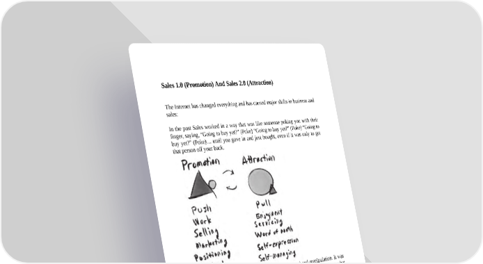 Sales 1.0 (Promotion) And Sales 2.0 (Attraction) The Internet has changed everything and has caused major shifts in business and sales: In the past Sales worked in a way that was like someone poking you with their finger, saying, “Going to buy yet?” (Poke) “Going to buy yet?” (Poke) “Going to buy yet?” (Poke)… until you gave in and just bought, even if it was only to get that person off your back. Successful selling also used to be mostly about control and manipulation. It was about getting the deal done and the checkin, without worrying much about what happened afterward. Companies could sell expensive and crappy products and get away with it (at least for awhile). Before the Internet, it was much harder to find out how many customers were unhappy or had been failed. Now that’s all changed, because of the Internet and what I call “Frictionless Karma.” (If you do something good or bad, it comes back around to you right away, not in your next lifetime). Great companies know the sale is just the first step in an ongoing process of