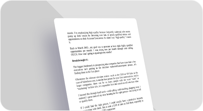 month. I’m emphasizing high quality because frequently outbound sales teams pump up their results by throwing over lots of poorly-qualified demos and appointments to their Account Executives. So when I say “high quality,” I mean it. Back to March 2003…my goal was to generate at least eight highly qualified opportunities per month. I was doing two per month through cold calling. OUCH. How was I going to quadruple my results? Breakthrough #1: The biggest bottleneck in prospecting into companies that have more than a few executives isn’t getting to the decision maker/influencer/point person…it’s finding them in the first place! Oftentimes the ultimate decision maker—such as the CEO or VP Sales in the case of Salesforce.com, is not the best person for your first conversations. And in larger companies, there can be so many people with the word “sales” or “marketing” in their title, it’s impossible from the outside to tell who does what. I learned this through hard work—cold calling, cold emailing, plugging away. I realized I spent most of my time hunting for the right person—not trying to sell or qualify them. If I could find the right person, I could usually have a productive business conversation with them. But it took a LOT of time to find them, especially in those byzantine Fortune 5000 companies! In Desperation, I Tried An Experiment I’d always assumed that mass emailing executives wouldn’t work. Don’t I need to carefully craft each email to them to make it personal? I wrote one email that was a classic cold calling letter: “Do you have these challenges? X, Y Z…” I also wrote a totally “short and sweet” different email—in plain text, with no HTML -- simply asking for a referral to the right person at the company. (I don’t share the actual email templates in this book for two reasons, which I will share