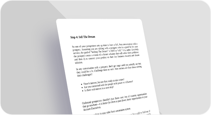Step 4: Sell The Dream So one of your prospectors sets up time to have a full, first conversation with a prospect. Assuming you are talking with a prospect who is a good fit for your service, the goal of “Selling The Dream” is NOT to “sell.” It is, rather 1) to help the prospect create a vision of a dream solution that will solve their problems; and then 2) to connect your product to their key business issue(s) and dream solution. In any conversation with a prospect, don’t get eager until you actually see that they could be a fit. Challenge them as well. How serious are they about solving their challenges?: There’s interest, but are they ready to take action? Are you connected with the people with power or influence? Is there real interest in a next step? Outbound prospectors shouldn’t just throw over lots of crummy opportunities that go nowhere—it is better for them to pass fewer, better opportunities to your Account Executives. Track everything in your sales force automation system. Once a prospector connects by phone with a prospect for a call to find out if there is a mutual fit, the biggest challenge is staying focused on the prospect’s business and not selling yours. Ask open-ended questions about their business first—how it’s organized, for example—before moving on to ask about challenges. Here are a series of sample questions you can customize and use in a Discovery Call. Realistically, in a first conversation a prospector might just ask 3-4 of these questions. They are roughly in order, starting with more general business questions and leading to more specific qualification questions: