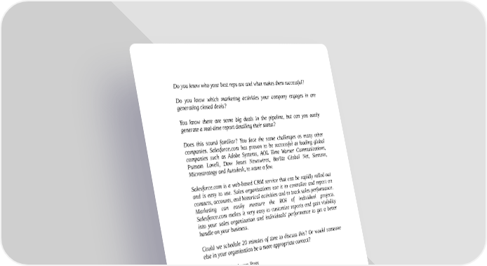 Do you know who your best reps are and what makes them successful? Do you know which marketing activities your company engages in are generating closed deals? You know there are some big deals in the pipeline, but can you easily generate a real-time report detailing their status? Does this sound familiar? You face the same challenges as many other companies. Salesforce.com has proven to be successful at leading global companies such as Adobe Systems, AOL Time Warner Communications, Putnam Lovell, Dow Jones Newswires, Berlitz Global Net, Siemens, Microstrategy and Autodesk, to name a few. Salesforce.com is a web-based CRM service that can be rapidly rolled out and is easy to use. Sales organizations use it to centralize and report on contacts, accounts, and historical activities and to track sales performance. Marketing can easily measure the ROI of individual projects. Salesforce.com makes it very easy to customize reports and gain visibility into your sales organization and individuals' performance to get a better handle on your business. Could we schedule 20 minutes of time to discuss this? Or would someone else in your organization be a more appropriate contact? Warm regards, Aaron Ross The above email is too long, impersonal, hard to read on a blackberry, sales-y and just uninteresting. Response rate: ZERO. Sending Your Campaigns Start by sending 150-250 outbound emails per week, over the course of 3-4 days. Again, your goal is to receive an average of 5-10 responses per day, because if you get more than that, they will start dropping through the cracks. One of the biggest mistakes our clients make is sending too many emails per day.
