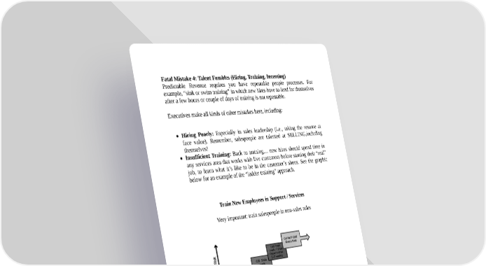 Fatal Mistake 4: Talent Fumbles (Hiring, Training, Incenting) Predictable Revenue requires you have repeatable people processes. For example, “sink or swim training” in which new hires have to fend for themselves after a few hours or couple of days of training is not repeatable. Executives make all kinds of other mistakes here, including: Hiring Poorly: Especially in sales leadership (i.e., taking the resume at face value). Remember, salespeople are talented at SELLING,including themselves! Insufficient Training: Back to training… new hires should spend time in any services area that works with live customers before starting their “real” job, to learn what it’s like to be in the customer’s shoes. See the graphic below for an example of the “ladder training” approach. Train New Employees in Support / Services Very important: train salespeople in non-sales roles Misguided Ramp Time Expectations Think 1-3 months for inside Account Executives, and up to 6-18 (yes 18!) months for field or enterprise Account Executives. What is the best way to help them ramp faster? Help them with lead generation, rather than counting on them to develop 100% of their own deals.
