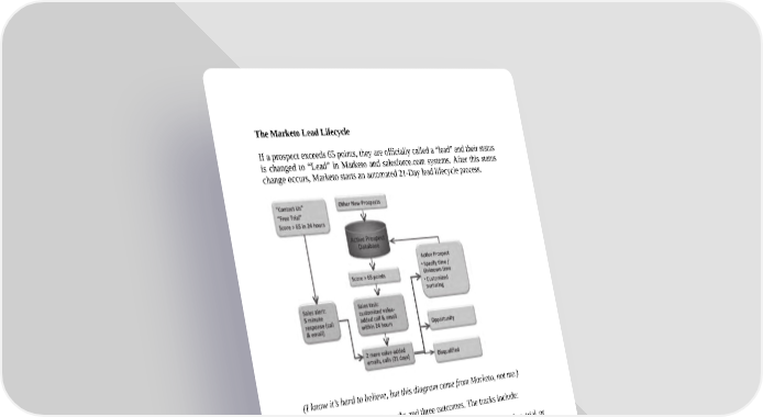 The Marketo Lead Lifecycle If a prospect exceeds 65 points, they are officially called a “lead” and their status is changed to “Lead” in Marketo and salesforce.com systems. After this status change occurs, Marketo starts an automated 21-Day lead lifecycle process. (I know it’s hard to believe, but this diagram came from Marketo, not me.) This process has multiple tracks and three outcomes. The tracks include: Fast Track: If a lead fills out a “contact me” form, requests a free trial or achieves a score of 65+, these leads receive personal follow-up within five minutes of their activity. The Inside Sales Reps get an automated and instant alert, telling them to follow-up with this lead immediately either by phone or email. Other New Prospects: If a prospect reaches a lead scoring threshold of 65 points but doesn’t match the “fast track” behavior, a sales task is set for the sales rep telling them to interact with this prospect within 24 hours.