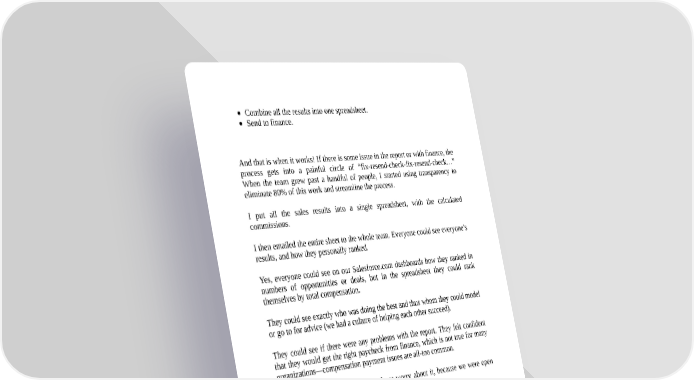Combine all the results into one spreadsheet. Send to finance. And that is when it works! If there is some issue in the report or with finance, the process gets into a painful circle of “fix-resend-check-fix-resend-check…” When the team grew past a handful of people, I started using transparency to eliminate 80% of this work and streamline the process. I put all the sales results into a single spreadsheet, with the calculated commissions. I then emailed the entire sheet to the whole team. Everyone could see everyone’s results, and how they personally ranked. Yes, everyone could see on our Salesforce.com dashboards how they ranked in numbers of opportunities or deals, but in the spreadsheet they could rank themselves by total compensation. They could see exactly who was doing the best and thus whom they could model or go to for advice (we had a culture of helping each other succeed). They could see if there were any problems with the report. They felt confident that they would get the right paycheck from finance, which is not true for many organizations—compensation payment issues are all-too common. They could trust in the process and not worry about it, because we were open and transparent with it. Ultimately, switching to this transparent process made comp reporting a snap for me and for them! I never took it to the next level, which would have been to have someone volunteer to be the Comp Lead, to manage the reporting and processing for me. But that would have been an easy next step.