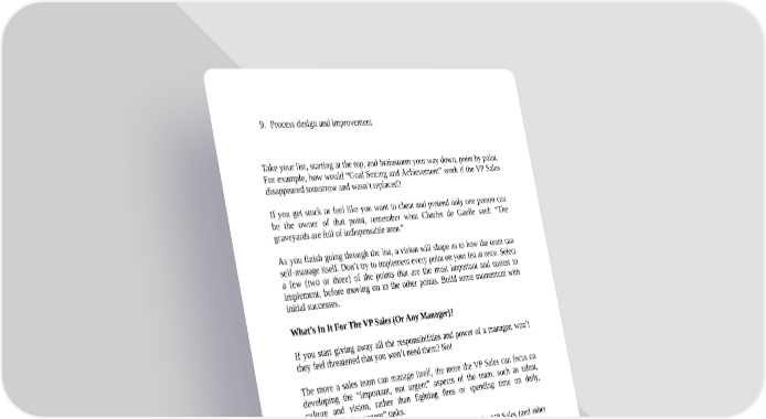 9. Process design and improvement Take your list, starting at the top, and brainstorm your way down, point by point. For example, how would “Goal Setting and Achievement” work if the VP Sales disappeared tomorrow and wasn’t replaced? If you get stuck or feel like you want to cheat and pretend only one person can be the owner of that point, remember what Charles de Gaulle said: “The graveyards are full of indispensable men.” As you finish going through the list, a vision will shape as to how the team can self-manage itself. Don’t try to implement every point on your list at once. Select a few (two or three) of the points that are the most important and easiest to implement, before moving on to the other points. Build some momentum with initial successes. What’s In It For The VP Sales (Or Any Manager)? If you start giving away all the responsibilities and power of a manager, won’t they feel threatened that you won’t need them? No! The more a sales team can manage itself, the more the VP Sales can focus on developing the “important, not urgent” aspects of the team, such as talent, culture and vision, rather than fighting fires or spending time on daily, “unimportant but urgent” tasks. Even better, by freeing up their own time and energy, the VP Sales (and other executives) can take on more of your (the CEO’s) responsibilities, and this allows you freedom and energy for even bigger things yourself! See how this works? You get what you give. Create more freedom and upside for your people, and you’ll get it in turn. When Distributing Responsibilities, Begin With Elimination As you work through your list of responsibilities and tasks, it’s a perfect opportunity to use the 80/20 rule to clear out non-essential tasks. Rather than