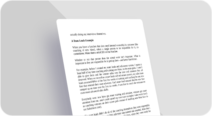 actually doing any interviews themselves. A Team Leads Example When you have a function that does need internal ownership by someone (like coaching of new hires), select a single person to be responsible for it, no committees. Make them a miniCEO of that function. Whether or not that person does the actual work isn’t important. What is important is they are responsible for it getting done—and better than before. For example, before I created my team leads and sub-teams system, I spent at least half of my time coaching and training new hires. As the team grew, I wasn’t able to give them and the veteran sales reps the time and attention they all deserved. When we moved to a team leads and sub-teams system, my sales team leads assumed 80%+ of the first few weeks of training and coaching for any new hire that entered their own sub-team. Each team lead ensured that the new hire ramped up on time over the first six weeks. I was free to coach the veterans on even more advanced sales skills. Everybody won: new hires got more training and attention, veterans got more attention from me, and I could spend my own time on higher value work (such as coaching veterans on their career path instead of teaching new hires how to use Salesforce.com). The team leads didn’t do all of the coaching themselves; they were responsible for ensuring a new hire on their sub-team was trained and coached. After that I would then come in and spend more time with them, when they were ready for more advanced one-on-one coaching. To align their goals with the goals of their sub-team, 20% of a team lead’s goals and compensation depended on the whole sub-team’s results. This 20% was extra compensation for taking on the responsibility of being a team lead. The other 80% of a team lead’s compensation depended on their individual sales performance. Some of the other functions that the sub-teams and team leads owned included: