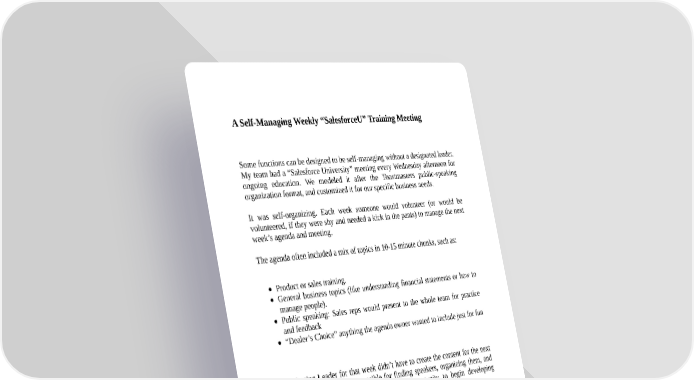 A Self-Managing Weekly “SalesforceU” Training Meeting Some functions can be designed to be self-managing without a designated leader. My team had a “Salesforce University” meeting every Wednesday afternoon for ongoing education. We modeled it after the Toastmasters public-speaking organization format, and customized it for our specific business needs. It was self-organizing. Each week someone would volunteer (or would be volunteered, if they were shy and needed a kick in the pants) to manage the next week’s agenda and meeting. The agenda often included a mix of topics in 10-15 minute chunks, such as: Product or sales training. General business topics (like understanding financial statements or how to manage people). Public speaking: Sales reps would present to the whole team for practice and feedback “Dealer’s Choice” anything the agenda owner wanted to include just for fun The Meeting Leader for that week didn’t have to create the content for the next meeting; they were just responsible for finding speakers, organizing them, and running the meeting. This was their own opportunity to begin developing miniCEO skills at a very basic level. Here is a specific example of a Salesforce University (SalesforceU) agenda: 1. Meeting Leader Opening (1min): Got the meeting started on time. Introduced first speaker. Kept the meeting on track and on time. 2. Sales Skills 1 (10-20min): We usually used this block for public speaking/presentation practice, from simple firsttime presentations up to a full sales role-play exercise, including a business scenario, pitch, objection handling, and competition. Before moving on, the Meeting Leader asked