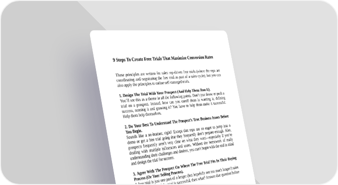 9 Steps To Create Free Trials That Maximize Conversion Rates These principles are written for sales rep-driven free trials (where the reps are coordinating and negotiating the free trial as part of a sales cycle), but you can also apply the principles to online self-managed trials. 1. Design The Trial With Your Prospect (And Help Them Run It). You’ll see this as a theme in all the following points. Don’t just throw or push a trial on a prospect. Instead, how can you enroll them in wanting it, defining success, running it and growing it? You have to help them make it successful. Help them help themselves. 2. Do Your Best To Understand The Prospect’s True Business Issues Before You Begin. Sounds like a no-brainer, right? Except that reps are so eager to jump into a demo or get a free trial going that they frequently don’t prepare enough. Also, prospects frequently aren’t very clear on what they want—especially if you’re dealing with multiple influencers and users. Without the homework of really understanding their challenges and desires, you can’t begin with the end in mind and design the trial for success. 3. Agree With The Prospect On Where The Free Trial Fits In Their Buying Process (Or Your Selling Process). A free trial is just one part of a longer (but hopefully not too much longer!) sales or buying cycle. If the trial is successful, then what? Answer that question before you begin the trial. 4. Better To Nail Fewer (Or A Single) Key Problems Than Try To Solve Every Problem For Everyone. The trial will only be a success if the prospect gets value and knows it. Everyone is busy, so pick your battle. Where can you show the biggest bang-for-the-buck? (In this case, “buck” means the prospect's time and attention.) What would be the easiest place to prove success? Build fast wins early and then add features over time. “If we could only solve 1-3 things with this trial, what would they be?” 5. Define With The Client What A “Successful Trial” Means.