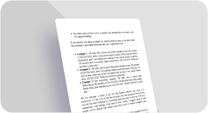 Say their name at least twice, as people love hearing their own name, and it’s rapport-building. If you haven’t sent them an email yet, send an email as soon as you leave them the voicemail—give them more than one way to get back to you. Example 1: “Hi John, this is Aaron Ross from Salesforce.com. My number is 555-555-5555. John, I sent you an email a couple of days ago and hadn’t heard back, and I was hoping you could give me a quick courtesy response. I’ll resend it here in a minute. Again, Aaron Ross, 555-555-5555. Thank you and have a great day.” Example 2: “Hi John, this is Aaron Ross from Salesforce.com. My number is 555-555-5555. John, I’m calling to follow up on the email I sent you, I’d love to hear either way if you can please help me out or not. Again, Aaron Ross, 555-555-5555. Thank you and have a great day.” Example 3: (the mysterious version): “Hi John, this is Aaron Ross following up. My number is 555-555-5555. I’m free after 3pm today. Again, Aaron Ross, from Salesforce.com, 555-555-5555. Thanks and have a great day.” The last message is likely to get you the highest callback rate, since it is mysterious. I’m not a fan of this last message with new prospects because they can call you back thinking it’s something important only to find out “Oh it’s a salesperson,” and leaving a bad taste in their mouth. I suggest using it with people you’ve already had contact with who could or should recognize your name. Voicemail can be effective in combination with email. When people do call you back directly, they’ll often say things like, “I wasn’t going to call you back at first, but you were so persistent...” or, “Thanks for the reminder, I’ve been meaning to call you back.…” Voicemail can be effective in combination with email. Voicemail also lets them hear your voice and helps establish that you’re a real human, which is why it’s important not to get too mechanical with scripts and lose the humanity in your voice.