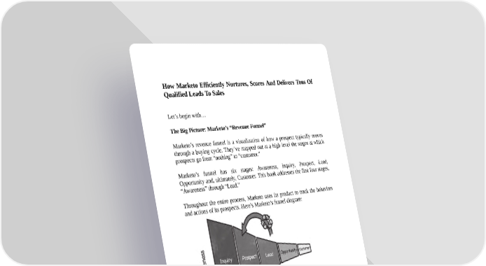 How Marketo Efficiently Nurtures, Scores And Delivers Tons Of Qualified Leads To Sales Let’s begin with… The Big Picture: Marketo’s “Revenue Funnel” Marketo’s revenue funnel is a visualization of how a prospect typically moves through a buying cycle. They’ve mapped out at a high level the stages at which prospects go from “nothing” to “customer.” Marketo’s funnel has six stages: Awareness, Inquiry, Prospect, Lead, Opportunity and, ultimately, Customer. This book addresses the first four stages, “Awareness” through “Lead.” Throughout the entire process, Marketo uses its product to track the behaviors and actions of its prospects. Here’s Marketo’s funnel diagram: Let’s walk through their marketing steps (Awareness, Inquiry, Prospect, and Lead) one-by-one. Stage 1. “Awareness”