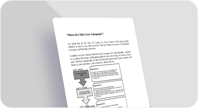"Where Do I Hire Great Salespeople?" I'm asked this all the time. Of course it's always hard to find great people, whether in sales or any other function. The best long-term source of salespeople is to grow and develop your own. Combine one part veteran with three parts young, smart and adaptable... and mix in a system that keeps challenging people to learn new things, to stretch, step by step. The best salespeople are the ones that have grown up in your company, and know it, your products, your customers, inside and out. Create A Farm Team System Think about how you can create a career path for people, to continually develop and grow them. Each group can act as a feeder team to the next. Here's a startup/ small sales team example:
