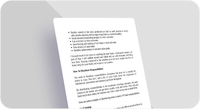 Quality control of the work produced (we had an audit process to verify sales results and deals before approving them as commissionable). Small incentive/marketing budgets for their sub-team. Fun activities for their sub-team. Interviewing and training of new hires in their sub-team. Peer reviews of each other. Monthly achievement of sub-team sales goals. I focused much of my time on coaching the team leads—training the trainers. As part of that, I still walked around and talked and sat with everyone, including new hires. Staying connected to the trenches gave me more insight into how to better help the team leads and improve our systems. How To Distribute Responsibilities You need to distribute responsibilities throughout the team (or to outside the team) in ways that don’t add a lot of extra work; hence the importance of elimination, automation and outsourcing before delegation. By distributing responsibilities to the employees touching customers, the ones closest to the action, you can get better quality work and results. They will also learn much more about the business and what it takes to succeed as miniCEOs. Here are some examples of distributing some common VP Sales responsibilities: Goal Setting: What conditions would have to exist for the team to be able to set and achieve its own goals better than before? 80/20 rule: How much of the goals-setting process isn’t that important? Do you really need to set and track 15 goals? What are the 20% of the goals that matter the most? What if you have a “Goals Setting Lead” on the team to be the point person to manage the process, both within the team and with the CEO? Do you need a separate “Quota Beating Lead” to monitor and report on the teams overall progress each month, and flag areas of concern?