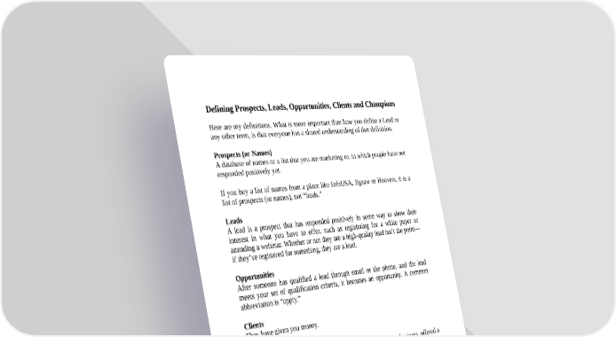 Defining Prospects, Leads, Opportunities, Clients and Champions Here are my definitions. What is more important than how you define a Lead or any other term, is that everyone has a shared understanding of that definition. Prospects (or Names) A database of names or a list that you are marketing to, in which people have not responded positively yet. If you buy a list of names from a place like InfoUSA, Jigsaw or Hoovers, it is a list of prospects (or names), not “leads.” Leads A lead is a prospect that has responded positively in some way to show their interest in what you have to offer, such as registering for a white paper or attending a webinar. Whether or not they are a high-quality lead isn’t the point— if they’ve registered for something, they are a lead. Opportunities After someone has qualified a lead through email or the phone, and the lead meets your set of qualification criteria, it becomes an opportunity. A common abbreviation is “oppty.” Clients They have given you money. Champions A champion can be a client or non-client that has referred you business, offered a testimonial, or has actively supported you in any other way. Be sure to give them love!