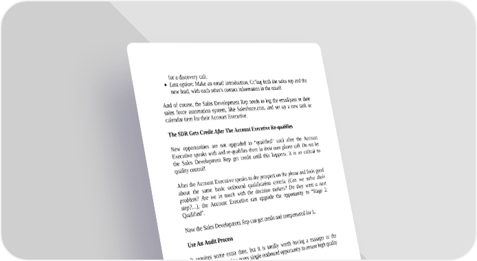 for a discovery call. Last option: Make an email introduction, Cc’ing both the sales rep and the new lead, with each other's contact information in the email. And of course, the Sales Development Rep needs to log the email/pass in their sales force automation system, like Salesforce.com, and set up a new task or calendar item for their Account Executive. The SDR Gets Credit After The Account Executive Re-qualifies New opportunities are not upgraded to “qualified” until after the Account Executive speaks with and re-qualifies them in their own phone call. Do not let the Sales Development Rep get credit until this happens, it is so critical to quality control! After the Account Executive speaks to the prospect on the phone and feels good about the same basic outbound qualification criteria (Can we solve their problem? Are we in touch with the decision makers? Do they want a next step?…), the Account Executive can upgrade the opportunity to “Stage 2: Qualified”. Now the Sales Development Rep can get credit and compensated for it. Use An Audit Process It requires some extra time, but it is totally worth having a manager or the company owner review every single outbound opportunity to ensure high quality and integrity of the results. As soon as an opportunity is upgraded, check it to ensure all of the following: Was this truly an incremental outbound opportunity? Not an inbound lead from your website? Was it re-qualified by the Account Executive by phone? (Sometimes an Account Executive would “do a favor” for their Sales Development Rep and upgrade opportunities before they re-qualified—a big no-no). Did the Sales Development Rep and Account Executive enter notes into your sales automation system appropriately? If it doesn’t exist in your