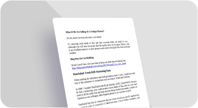 What If We Are Selling To A Unique Market? Do the above services not meet your needs? It’s amazing what kinds of lists and data overseas firms can build for you , although you will have to accept that the quality may not be great. Elance. com is an excellent resource to post projects and receive multiple bids from overseas vendors. Blog Post On List Building Brian Carroll has a nice post here to help you think about building lists: http://blog.startwithalead.com/weblog/2007/03/would_you_buy_t.html DataSalad: Fresh B2B Marketing Data When running the Salesforce.com lead generation team, I wish I would have had lists of the customers of competitors such as Oracle, Siebel and NetSuite. In 2008 I founded DataSalad with Brian Mackley (CEO, DeepWWW), because he had a technology that could produce those kinds of lists, and we were both tired of all the junky lists and data sources being hocked and resold. Another ex- Salesforce.com colleague, John Bogard, joined us as a partner in 2010. DataSalad has lists of companies that are clients of and use specific applications —such as a list of customers of Salesforce.com, a list of Webex customers, and much more. Where The Lists And Data Come From People and companies leave all kinds of “digital fingerprints” on the Web. DataSalad generates the list of application-specific customers by crawling dozens of different sources of online information and databases, such as job boards and discussion groups. Then the technology interprets these fingerprints and fragments to reassemble the data together into full records. The data is verified and crosschecked prior to being added to our database.
