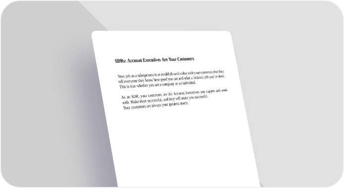 SDRs: Account Executives Are Your Customers Your job as a salesperson is to establish such value with your customers that they tell everyone they know how good you are and what a fantastic job you’ve done. This is true whether you are a company or an individual. As an SDR, your customers are the Account Executives you support and work with. Make them successful, and they will make you successful. Your customers are always your greatest assets.