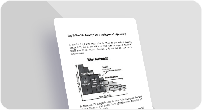 Step 5: Pass The Baton (When Is An Opportunity Qualified?) A question I get from every client is, “How do you define a qualified opportunity?”, that is, one which the inside Sales Development Rep (SDR) should pass to an Account Executive (AE), and that the SDR can be compensated on. In this section, I’m going to be using the terms “Sales Development Rep” and “Account Executive” a lot, so while I’m not a fan of acronyms, I sometimes will use “SDR” and “AE” for brevity. This process below was just for the outbound sales process. Salesforce. com had different qualification criteria for leads coming in through the website (“inbound leads”), which were routed to a totally different Market Response Reps team. After lots of experimentation, these simple guidelines worked the best for our outbound generated opportunities…. The Basics Apart from the qualification criteria, in order to be compensated for a new opportunity, the Sales Development Rep must find opportunities which: