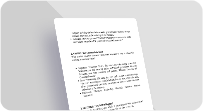 company by being the best in the world at generating new business, through constant innovation and the sharing of our expertise.” Individual (from my personal V2MOM):“Manageteam members as a leader who will be remembered 10 years from now as their best ever.” 2. VALUES: Top General Priorities? What are the top three business values most important to keep in mind while working toward that vision? Corporate: “Customer Trust”, this was a top value during a year that Salesforce.com had recurring uptime and technology problems that were damaging trust with customers and partners, “Flawless Execution and Customer Success.” Team: “Persistency. Efficiency. Success.” Each can have multiple meanings. “Success” meant success of each individual on my team, of the sales team, of our prospects and customers, and anyone we came in contact with inside and outside of the company. Individual: “Hands-on Leadership. Watertight Execution. Practical Innovation.” 3. METHODS: How Will It Happen? What are the actual things you will do to hit your goals? What will you create? Rather than vague generalities, be as specific and clear as you can. Corporate: “Increase adoption through sales, service, and partner effectiveness by…” including more detailed specifics about programs and practices to clarify what this actually means. Team: “Don’t take‘NO’ until you get to the VP Sales.” While it might seem obvious to have this as a sales tactic, I found that new salespeople gave up too easily when they received “no” from someone like the VP Marketing. It was so important to reinforce this practice of never giving up at an ideal prospect that we made it a V2MOM Method. Individual: “Lead from the trenches.” I never asked people to do something I wouldn’t do. I kept as close to them as possible and involved them in my