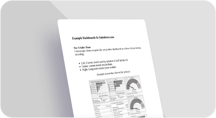 Example Dashboards In Salesforce.com For A Sales Team I encourage clients to generally set up their dashboards in a three column format, including: Left: Current month activity (amount of stuff going on). Center: current month results/deals. Right: Long-term results (year-to-date). Example screenshot, blurred for privacy: Example Sales Development Rep Dashboard